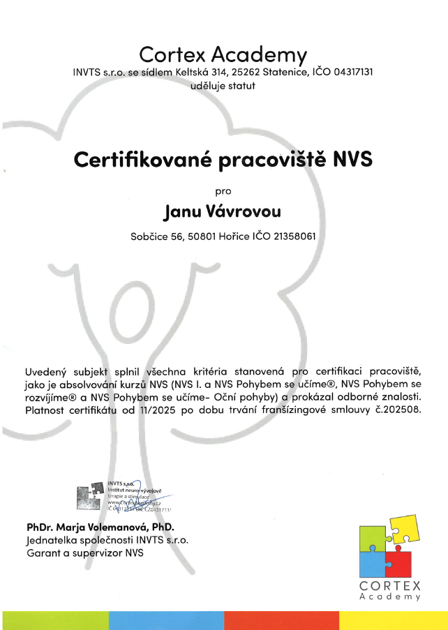 Neuro-vývojovou stimulací, NVS Pohybem se učíme® řešíme problémy od základů. Pro správné učení a chování potřebujeme dobrou spolupráci mozku s tělem. Pro čtení potřebujeme plynulé pohyby očí, pro psaní správnou koordinaci ruka-oko, a pro všechny motorické schopnosti potřebujeme rovnováhu. Problémy učení nemusí být způsobeny nízkou inteligencí.