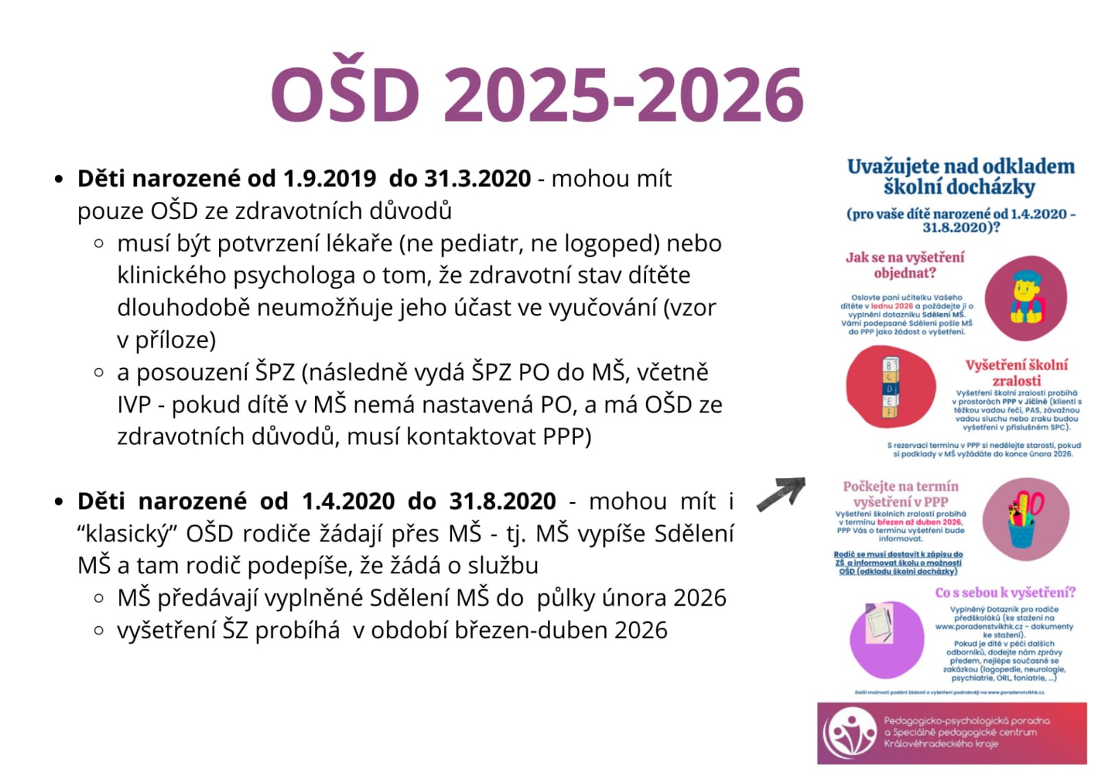 Rodiče žáků, kteří budou žádat o odklad školní docházky, vyplní žádost o odklad a dodají souhlasné stanovisko dětského lékaře nebo klinického psychologa a pedagogicko-psychologické poradny. V případě, že tato dvě stanoviska nemají, zašlou či podají pouze žádost o odklad. Tím se přeruší správní řízení do doby než rodiče 2 dokumenty dodají a budou moci rozhodnout o odkladu školní docházky.