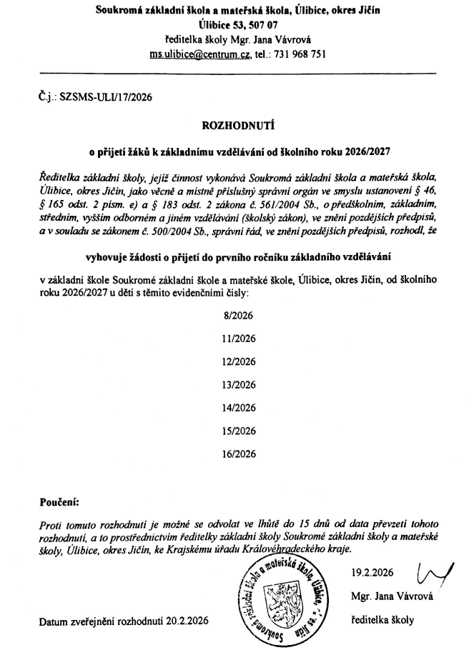 Informace o přijetí do školy bude zveřejněna pod registračním číslem na webových stránkách školy a na vchodových dveřích do 30 dnů.